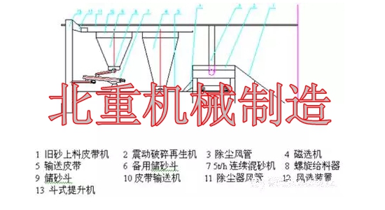 人工落砂后,舊砂通過上料皮帶機進入振動落砂機完成落砂、破碎、篩分,再生,經(jīng)過帶由磁選的輸送皮帶進入斗式提升機,在輸送過程中人工加入新砂。在斗提的出口處安裝風(fēng)選裝置,經(jīng)過風(fēng)選的型砂經(jīng)皮帶輸送機進入儲砂斗。劃線平臺鑄件生產(chǎn)時,型砂從砂斗經(jīng)螺旋給料器進入混砂機。